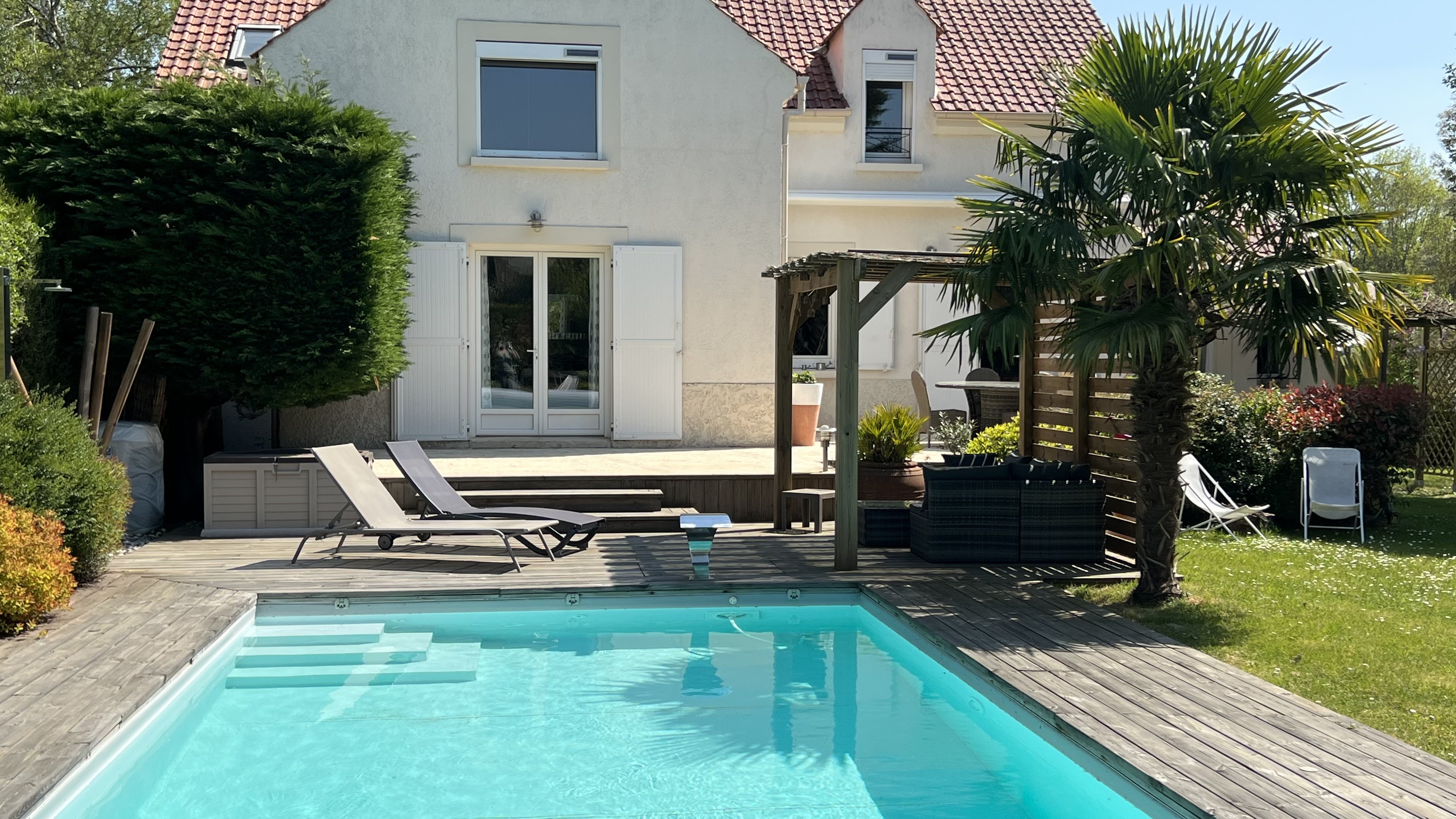 En périphérie de la ville de Fontainebleau, au calme dans un quartier résidentiel, construction de 2008, 274 m² environ, 9 pièces, 4/5 chambres sur un terrain de 2297 m² environ avec piscine 10 X 5 tr...